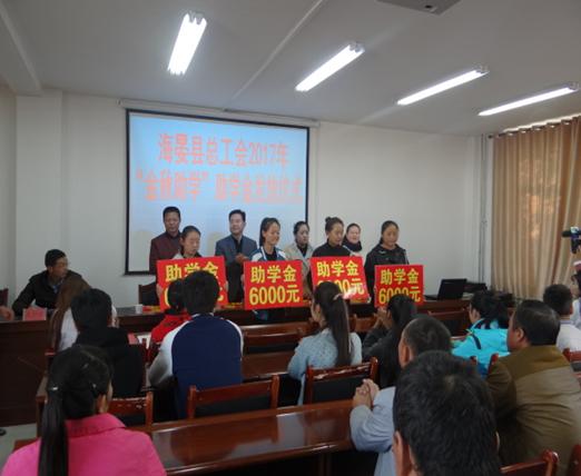 为深入贯彻落实省第十三次党代会精神和进一步推进困难职工解困脱困工作,积极协助党委、政府切实解决困难职工家庭子女上学难的实际问题。8月29日,我会举办了2017年“金秋助学”活动,县委常委、宣传部长、县总工会主席马志龙同志,县人民政府副县长忠格吉同志,县政协副主席海青同志出席了助学金发放仪式。